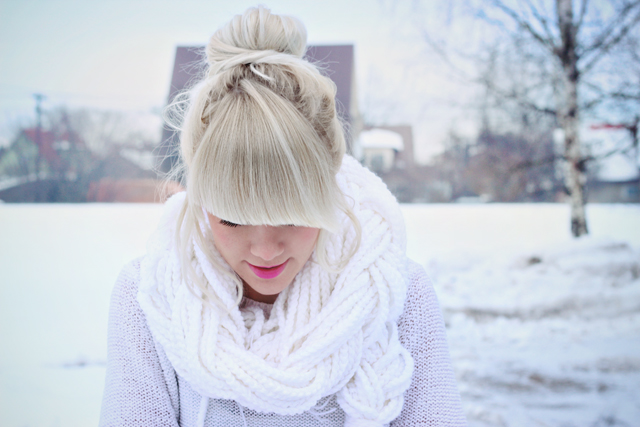 Võiks ju loota, et need pildid jäävad viimasteks, kus seljataga laiuvad lumevallid ja õhus on külmakraade rohkem kui üks, aga eile rongijaamast koju uisutades suri ka see viimane lootusekiir. Vot, aga tegelikult ma ei nurise sest nagu ma juba vist korduvalt maininud olen, siis tundub, et eelmises elus olin ma pingviin või jääkaru või lumehelves, sest just sellises kliimas tunnen ma ennast kõige kodusemalt. Vot ja nüüd ongi teie ees ühed jäised pildikesed, mis tegelikult juba päris pikka aega postitamist ootavad. Salli nikerdasin umbes kaks aastat tagasi ja seelik valmis katse-eksitus meetodil. Vaja läks vaid natuke teksat ja tülli, veidi valgendajat ja peotäis kannatust. Tulemus tuli üllatavalt muhe ja nüüd on juba üks väike suvine kleidike pangis valmimas. Lasengi teid nüüd pilte uudistama ja nagu ikka, olge tublid mu hiirekesed! :)